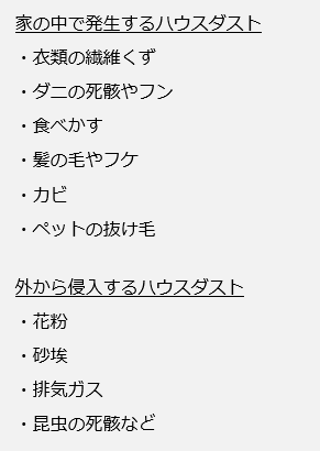 ハウスダストは、室内に浮遊または堆積している微細な粒子で、健康やアレルギーに影響を及ぼすことがあるものとされています。ハウスダストの大半は、ダニやその死がいやフン、人やペットの毛やフケ、繊維くず、カビやその胞子などによるものです。