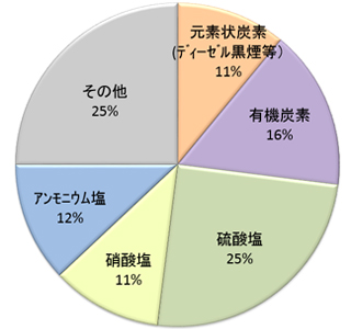 PM2.5の成分組成の全国平均は元素状炭素(ディーゼル黒煙等)11%、有機炭素16%、硫酸塩25%、硝酸塩11%、アンモニウム塩12%、その他25%からできています。 そのうち有機炭素、硫酸塩、硝酸塩などは、燃焼発生源からガス状物質として排出されたものが、大気中で化学変化により粒子化したものです。燃焼発生源から発生した粒子の寿命は数日から1週間程度です。