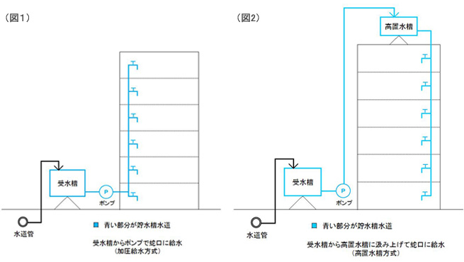 マンションや事務所ビル、学校等において、受水槽にいったん水道水を貯めて、その受水槽の水をポンプで建物内の各蛇口に給水したり(図1)、あるいは受水槽から建物の屋上にある高置水槽に汲み上げてから各蛇口に給水している施設(図2)があります。この受水槽や高置水槽をまとめて貯水槽と呼び、受水槽から蛇口に至るまでの給水系統全般を貯水槽水道と呼びます。受水槽に入る前までの水道水は水道事業者が責任を持ちますが、受水槽以降の給水系統と水質の維持管理は、貯水槽水道の設置者の責任で行う義務があります。