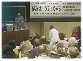 講演では、呼吸器系の防御機能の働きと、それに障害が生じた時に起こりうる疾病などについて多数のスライドをもとに、わかりやすくお話しいただきました。三藤先生、誠にありがとうございました。