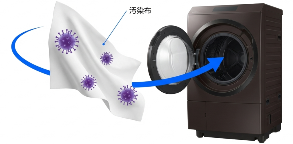衣類の試験:衣類等に微生物等を付着させ、洗濯前後で微生物等の残存率を比較