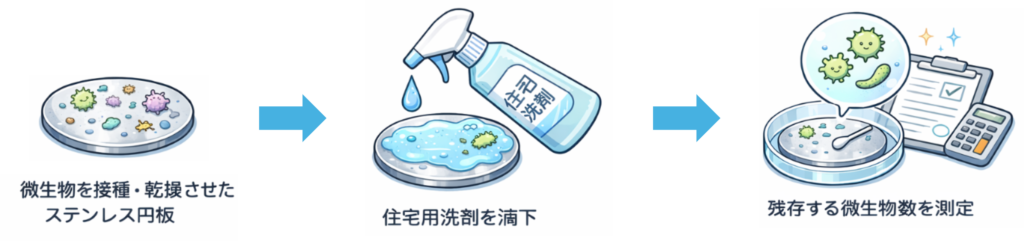 微生物を接種・乾燥させたステンレス円板に住宅用洗剤を滴下して5分間作用させます。所定時間作用後、ステンレス円板に残存する微生物数を測定して有効性を評価します。