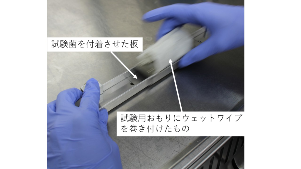 微生物を接種・乾燥させた担体(ステンレス板または床材)をウエットワイパーで拭き取り、担体に残存する微生物数を測定して有効性を評価します。EN規格によるウエットワイパーの試験方法の詳細は、情報館ページ「EN 16615:2015 消毒用ワイプの拭き取りによる殺菌および殺酵母性能評価試験の方法について」をご確認ください。